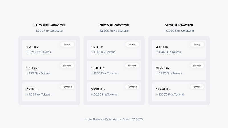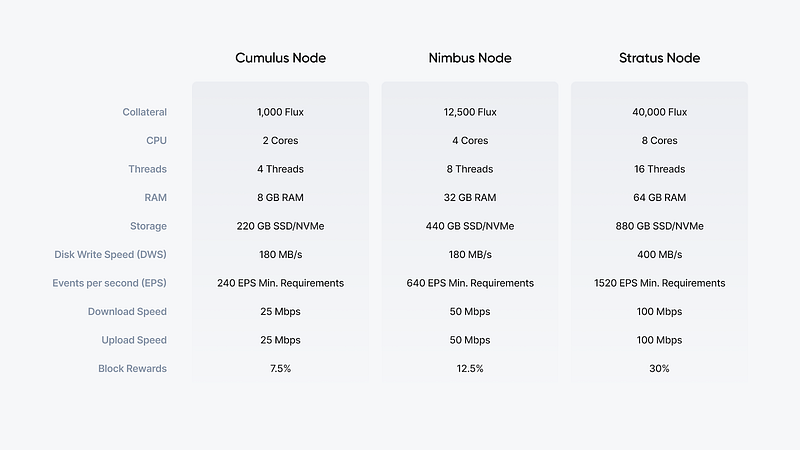 Each tier requires varying amounts of $FLUX staked as collateral and varying hardware specs to operate a node.
