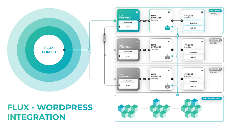 - Flux Operator: This is the “brains” of the operation and is responsible for synchronizing the databases. It tracks the cluster created and reaches out to other nodes to identify the primary node and resync the database to keep it up to date. The Flux Operator obtains cluster information from the Flux Blockchain, enabling it to link nodes running the same WordPress instance.
